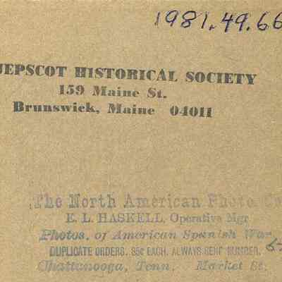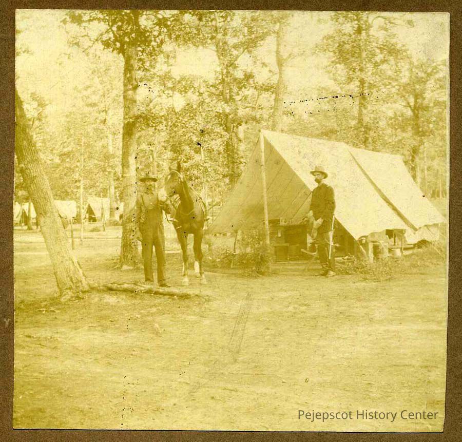 A B/W photo of two soldiers and a horse in front of a tent. Spanish American War.