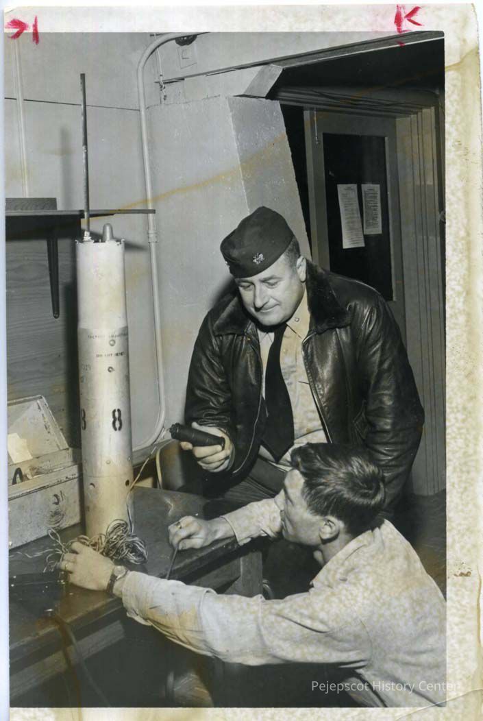 A picture of two men, one in uniform, examining a sonobuoy. The back of the picture reads: "Published in the Portland Sunday Telegram Jan 28,1962. Wiring technician Shaner and Comdr. Wm. R. Mott, avionics officer at the Brunswick base, examine the intricate network of wires and circuits within the sonobuoy." UndatedLexicon