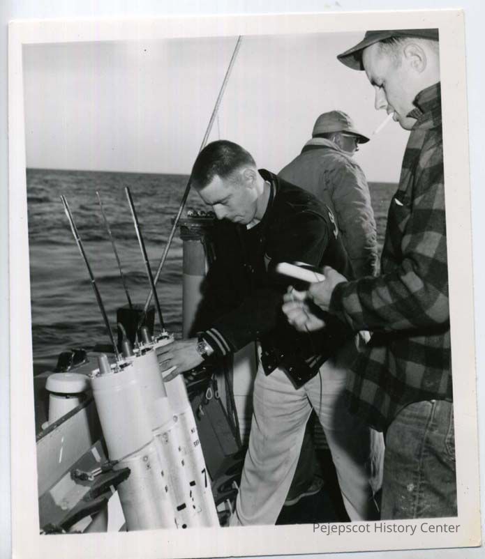 A picture of three civilians at a boat rail checking sonobuoys. The back of the picture reads; "from story in Portland Sunday Telegram. After sonobuoys are retrieved they are racked to be returned to the lab for more tests and final acceptance. Testing has improved reliability of the devices." The picture is stamped "U.S. Naval Air Station, Brunswick, Maine, Oct 23, 1960 Official U.S. Navy Photograph not for publication unless officially released." UndatedLexicon
