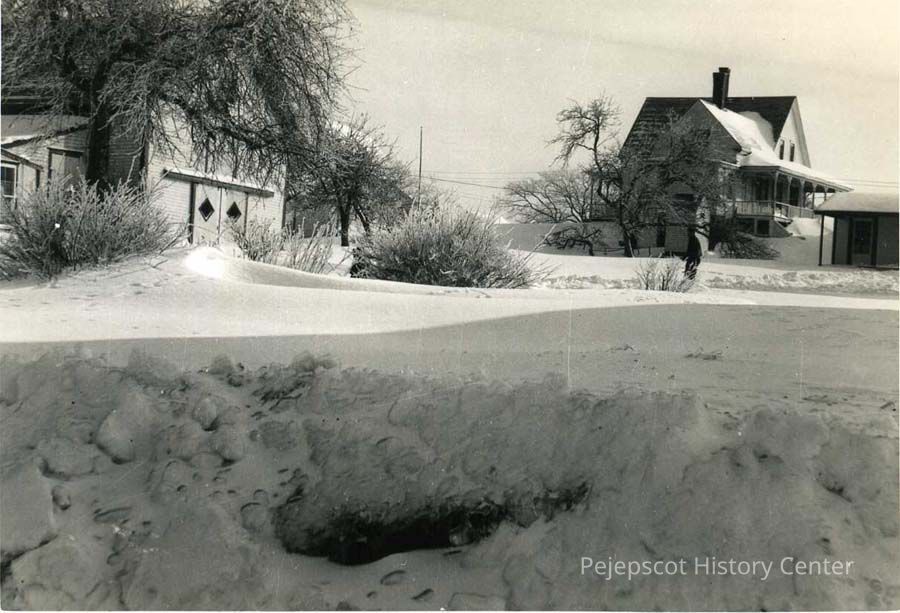 A black and white photo of South Harpswell, Maine in the winter, dated January 1947.