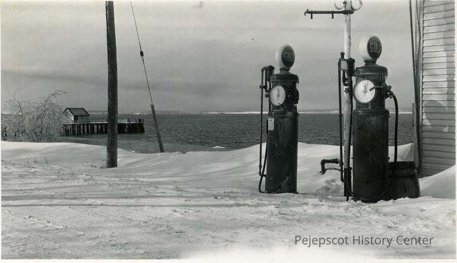 A black and white photo of South Harpswell, Maine in the winter, showing two gas pumps and the steamboat wharf off in the distance. Photo is dated January 1947.