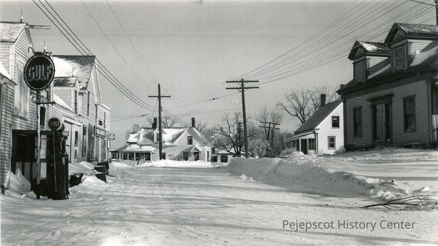 A black and white photo of South Harpswell, Maine in the winter, dated January 1947.