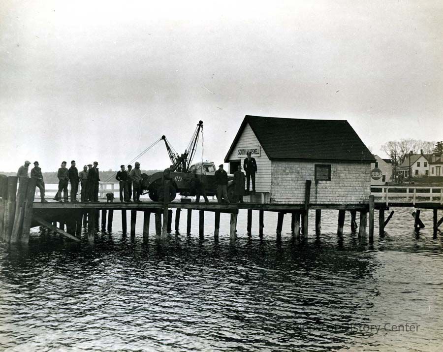 A B/W photograph of people on the dock waiting for a boat to arrive. The man nearest the building is a police officer and there is a wrecker on the dock. Undated