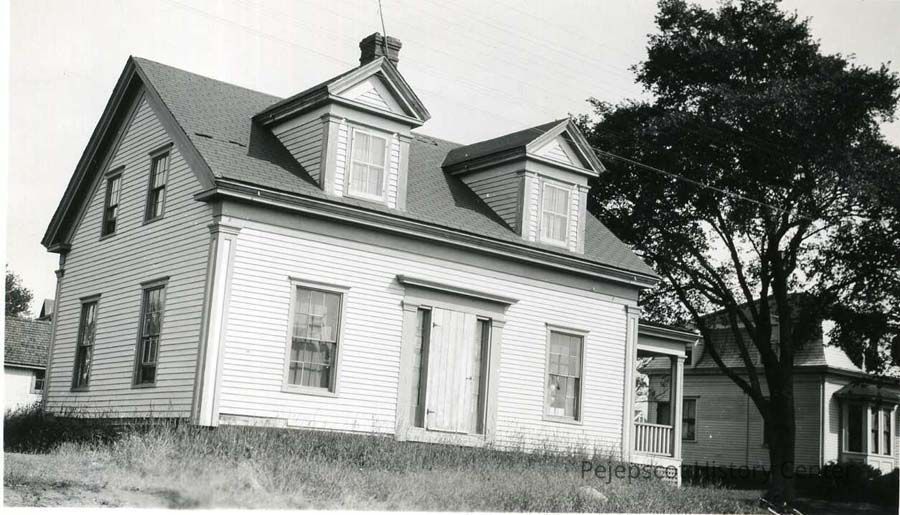 A black and white photo of the home of John Brown Sylvester in South Harpswell, Maine dated spring 1946. House at right is the Weeks House, built in 1864 for Ida and William B___dig (?)