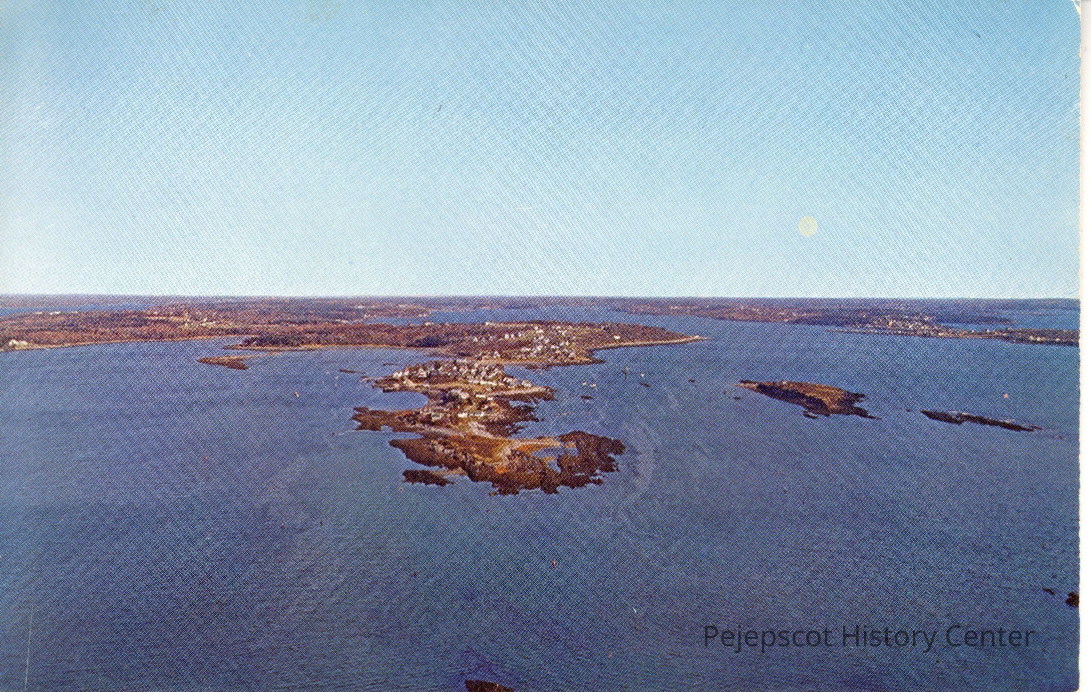 Color aerial photo postcard of South Harpswell, Maine, looking north from a point over Casco Bay. Ram Island to the right. Potts Point center, Ash Cove left, Bailey and Orr's Islands to the extreme right.Collection