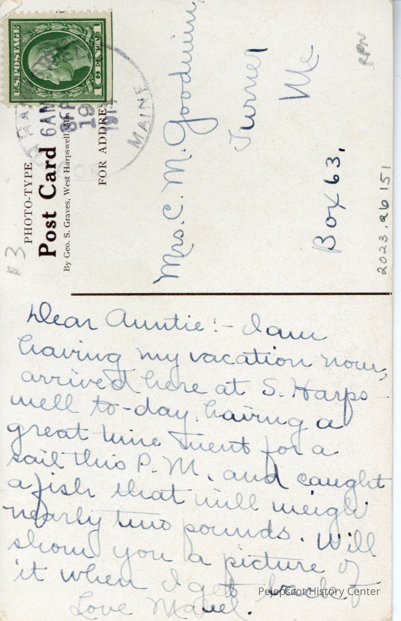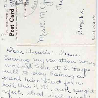 Dear Auntie! - I am having my vacation now, arrived here at S. Harpswell today, having a great time. Went for a sail this P. M. and caught a fish that will weigh nearly two pounds. Will show you a picture of it when I get back. Love, Mabel