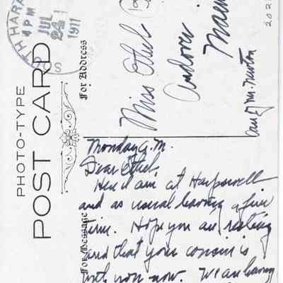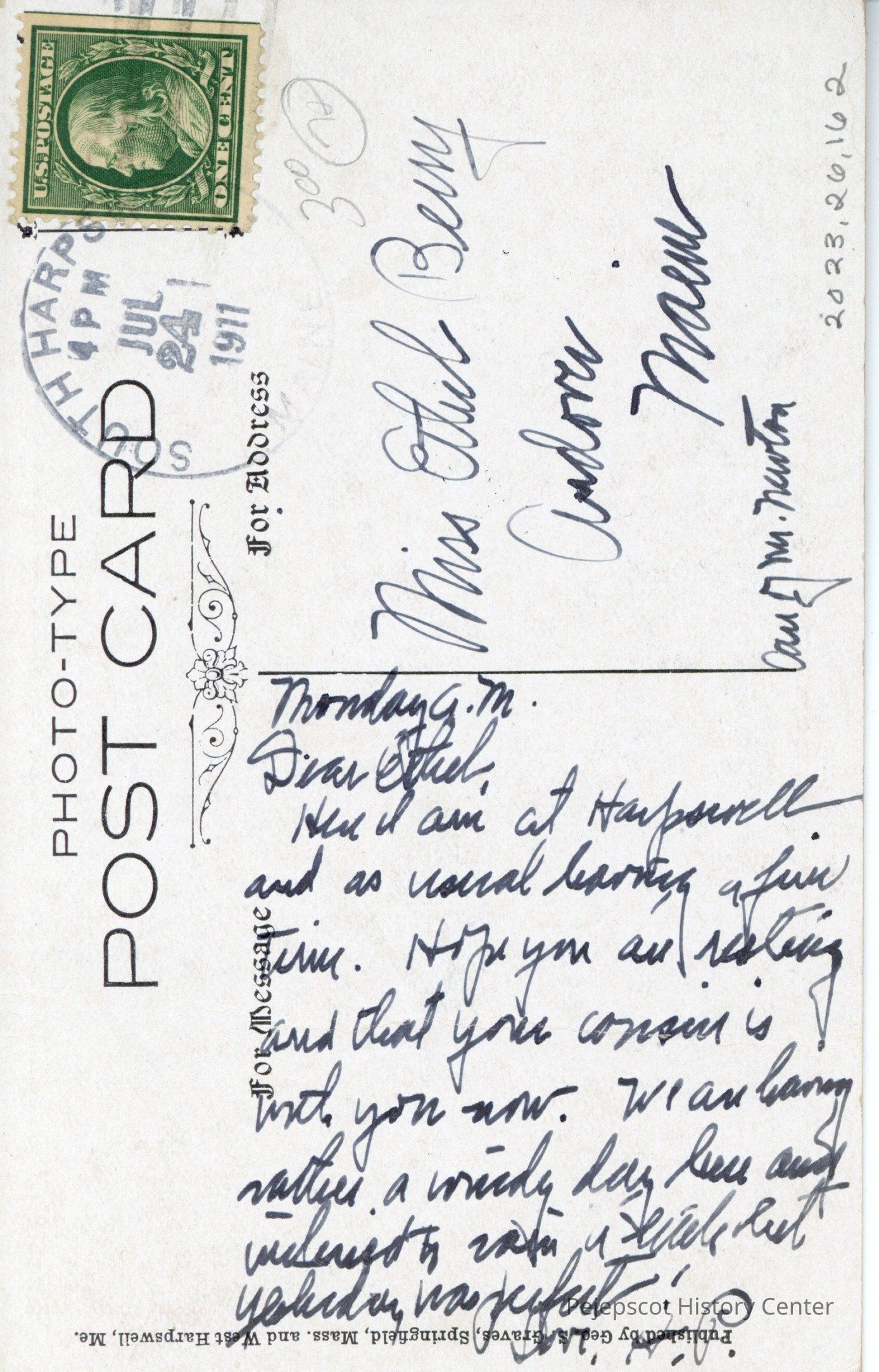 Dear Ethel, Here I am at Harpswell and as usual having a fine time. Hope you are resting and that your cousin is with you now. We are having rather a windy day here and expecting to rain a little bit. Yesterday was perfect. Love, H. P.
