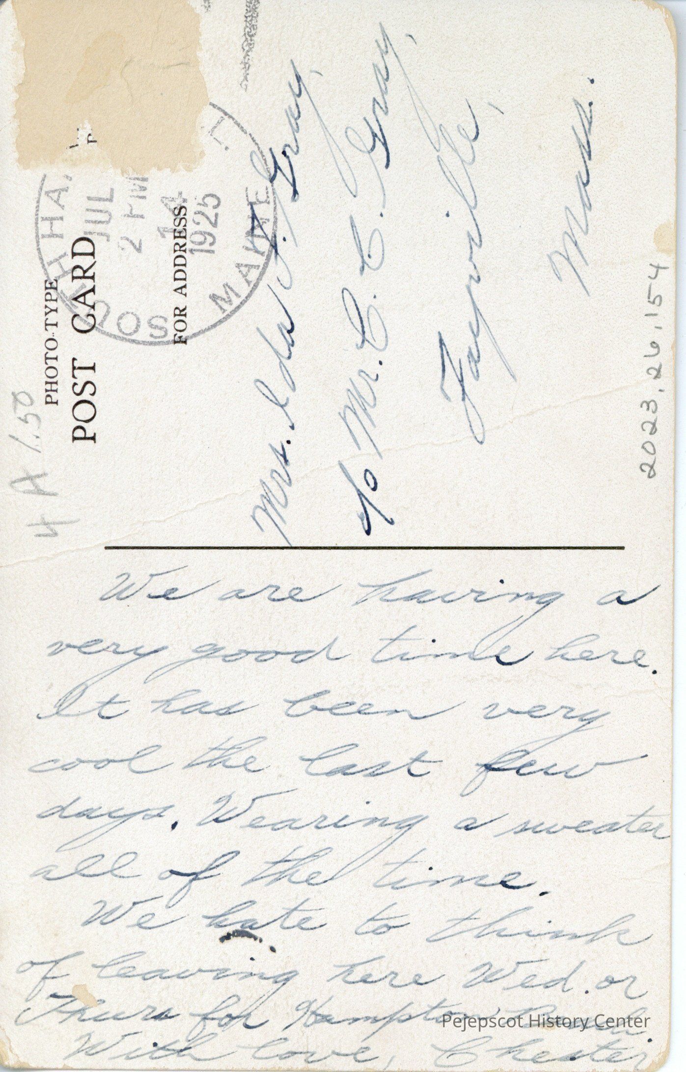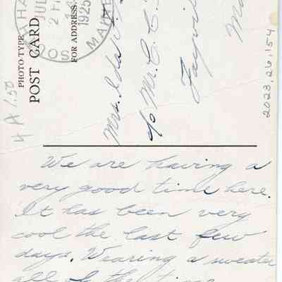 We are having a very good time here. It has been very cool the last few days. Wearing a sweater all of the time. WE hate to think of leaving here Wed. or Thurs for Hampton Beach. With love, Chester