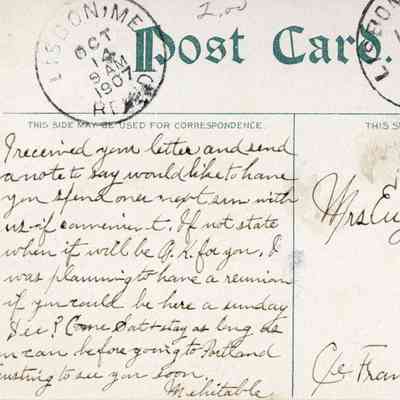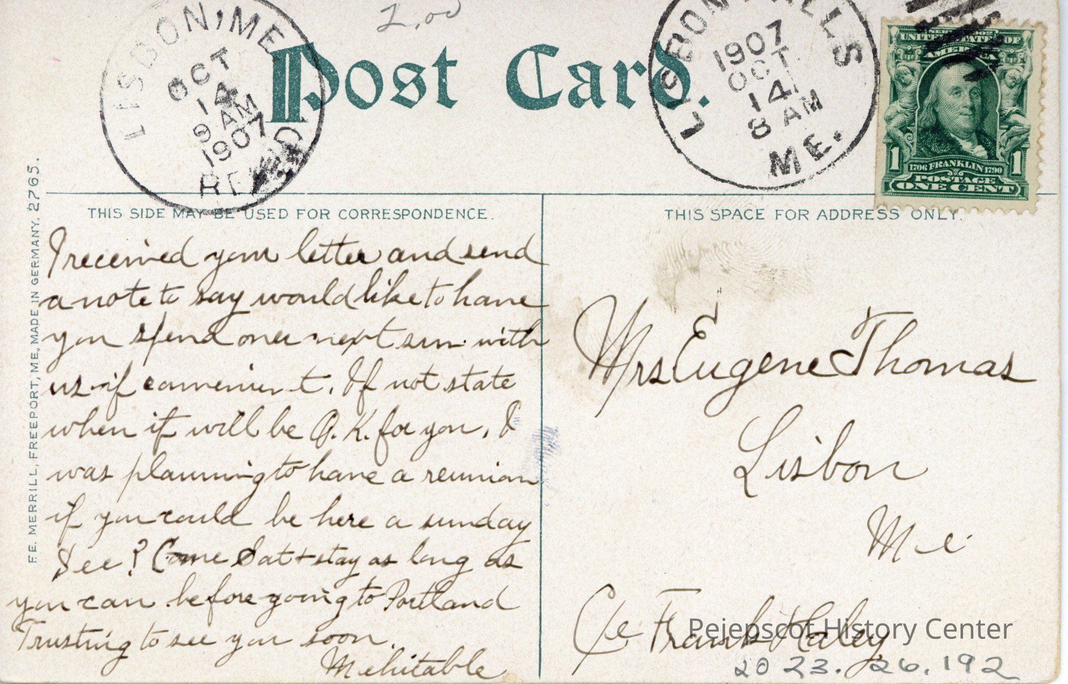 I received your letter and send a note to say would like to have you spend over next am with us if convenient. If not, state when it will be O.K. for you. I was planning to have a reunion if you could be here a Sunday See? Come Saturday as long as you can before going to Portland Trusting to see you soon. Mehitable