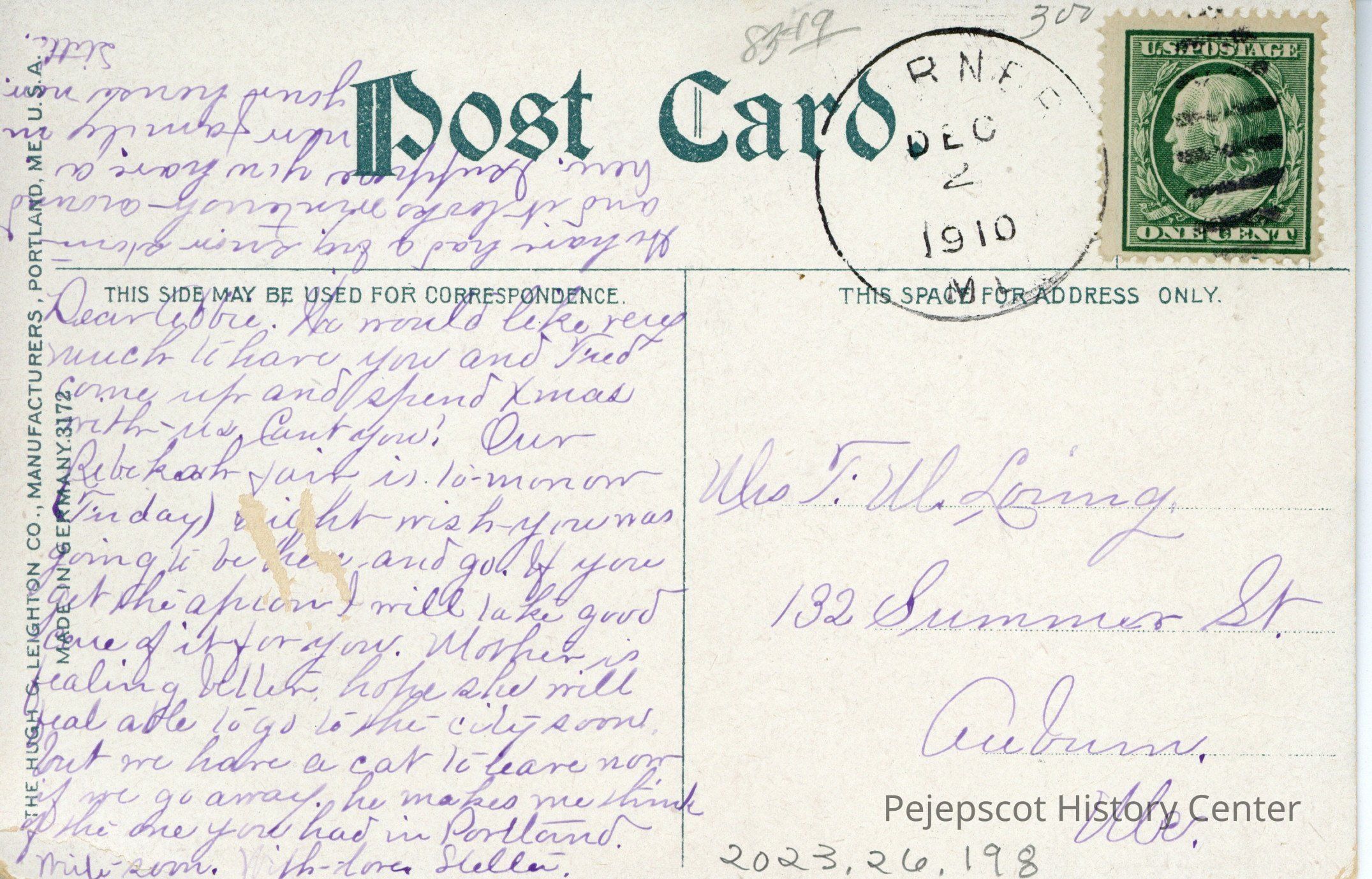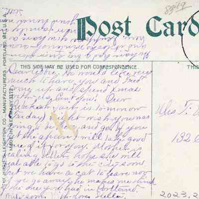 Dear Abbie, We would like very much to have you and Fred come up and spend Xmas with us. Can't you? Our Rebekah [?] is tomorrow (Friday) eight wish you was going to be here and go. If you get the apron I will take good care of it for you. Mother is feeling better hope she will feal able to go to the city soon, but we have a cat to leave now if we go away. he makes me think of the one you had in Portland. Write soon. With love Stella.