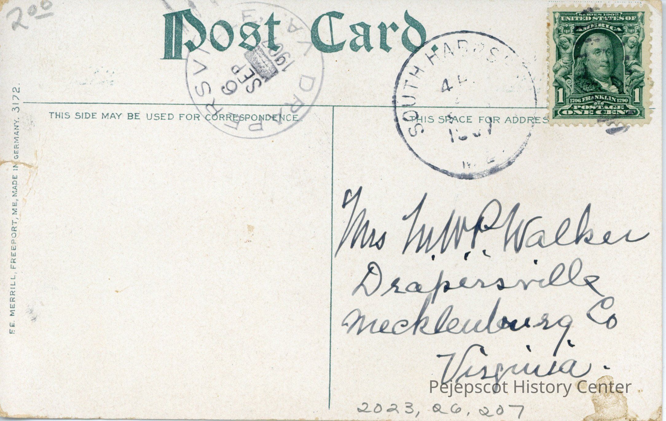 Green one cent postage stamp with Benjamin Franklin's portrait.Addressee