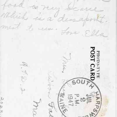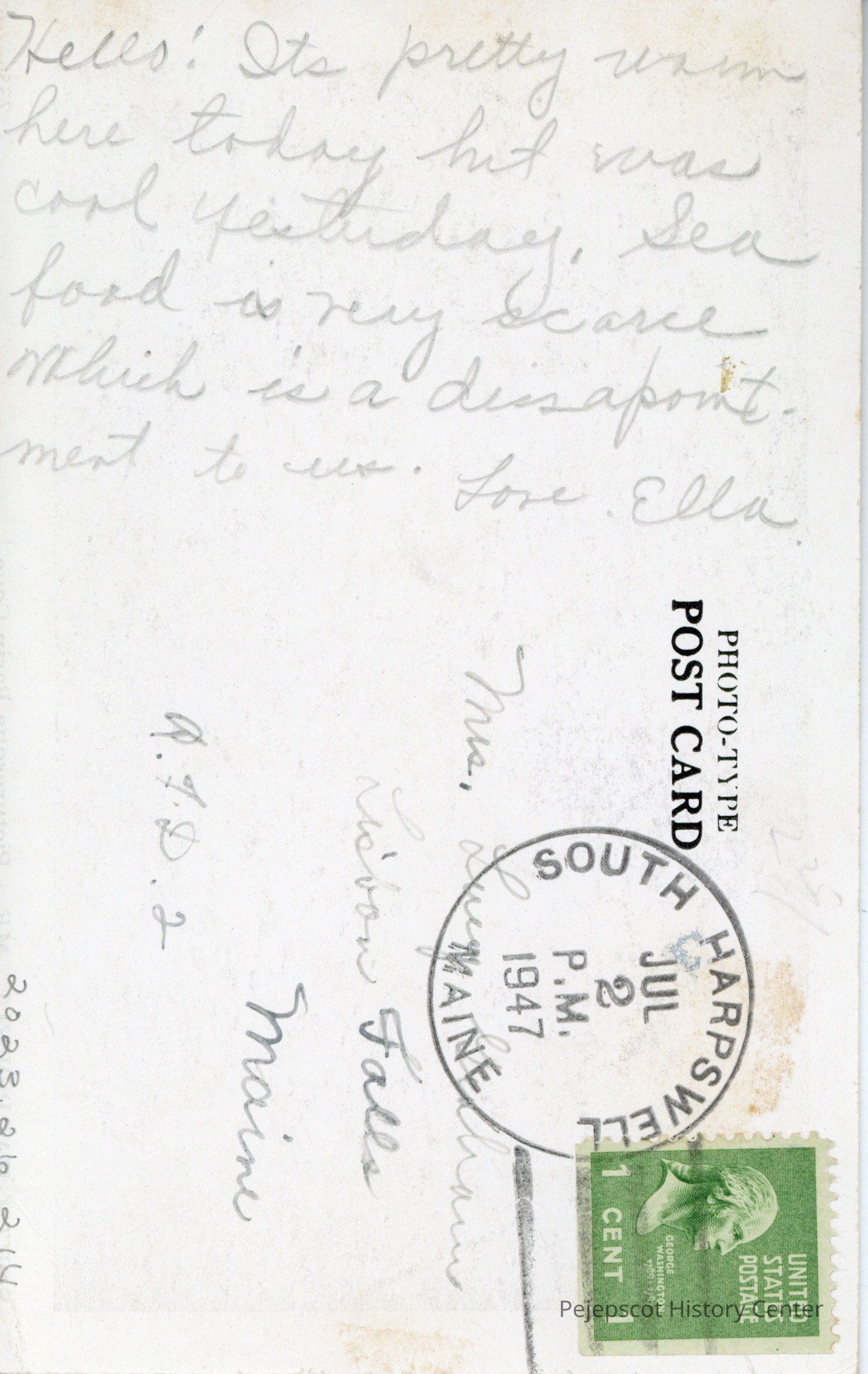 Hello! Its pretty warm here today but was cool yesterday. Sea food is very scarce which is a dissapointment [sic] to us. Love, Ella