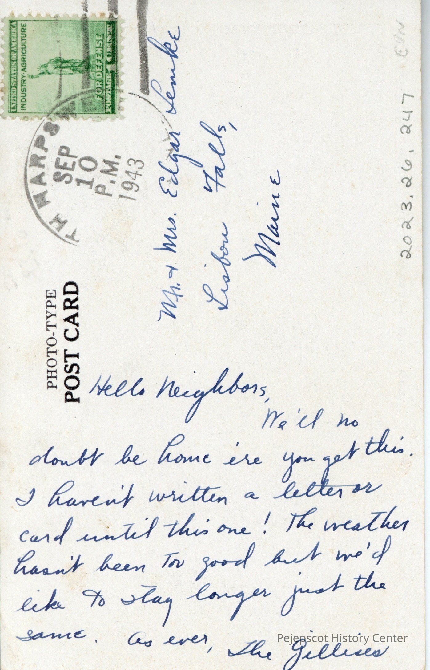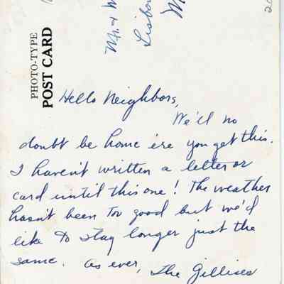 Hello Neighbors, We''ll no doubt be home ere you get this. I haven't written a letter or card until this one! The weather hasn't been too good but we'd like to stay longer just the same. As ever, The Gillises