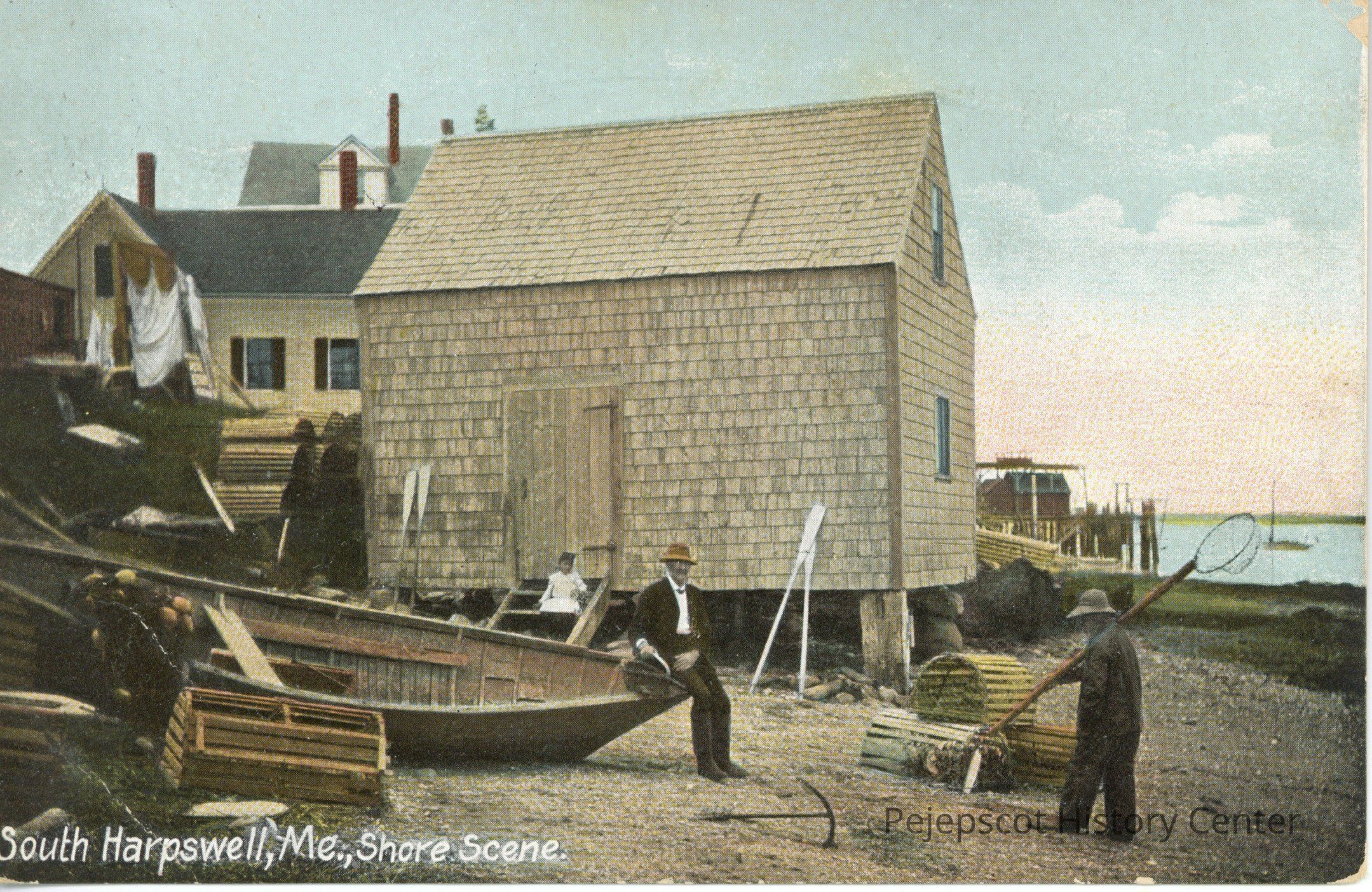 Color photo postcard of people working along the shore in South Harpswell, Me.Collection