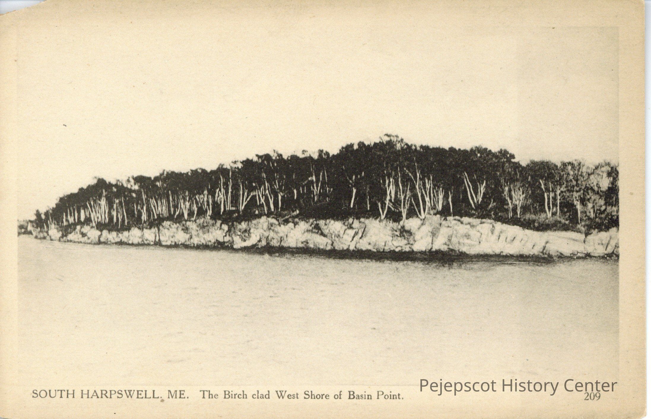 Black and white photo postcard of The Birch clad West Shore of Basin Point, South Harpswell, Me.Collection