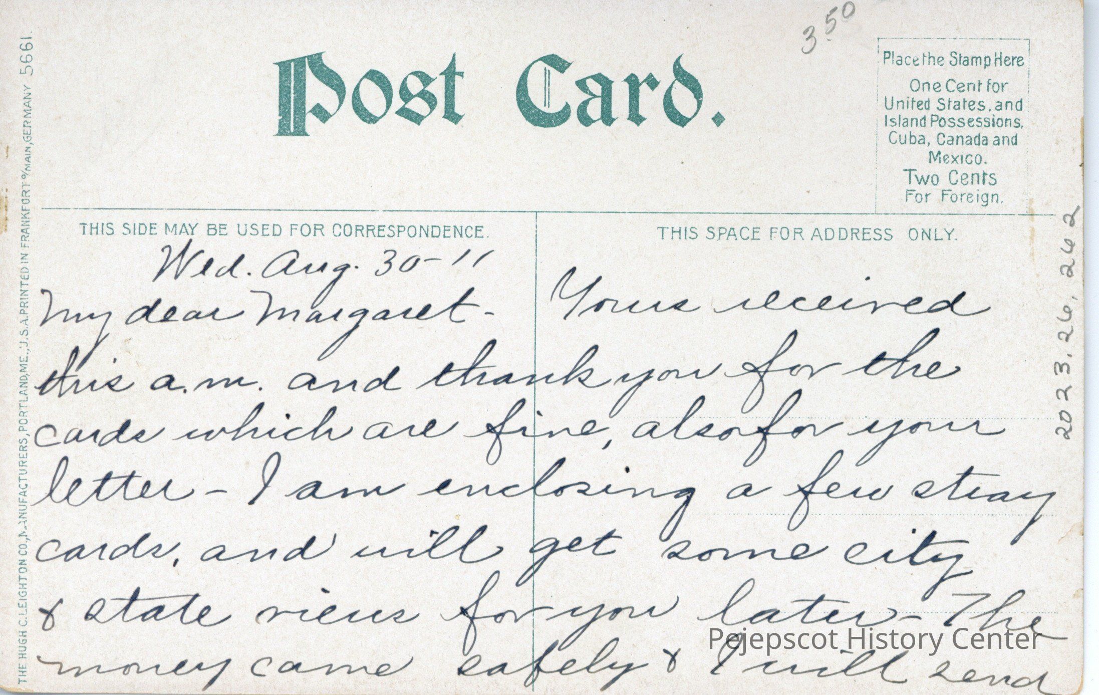 My Dear Margaret, Yours received this a.m. and thank you for the cards which are fine, also for your letter - I am enclosing a few stray cards, and will get some city & state views for you later - The money came safely & I will send