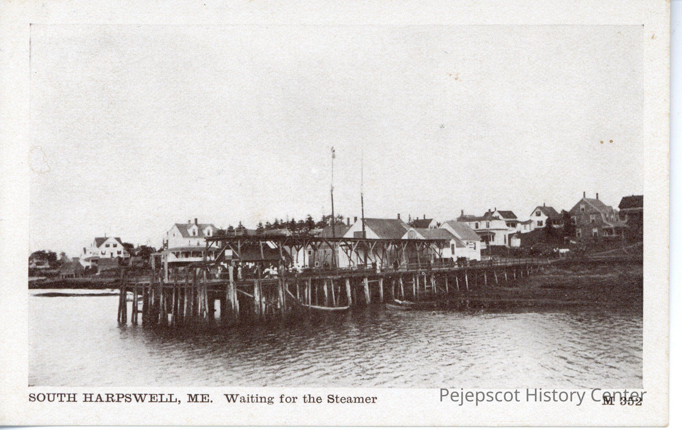 Black and white photo postcard of people waiting at the dock at South Harpswell, Me.Collection