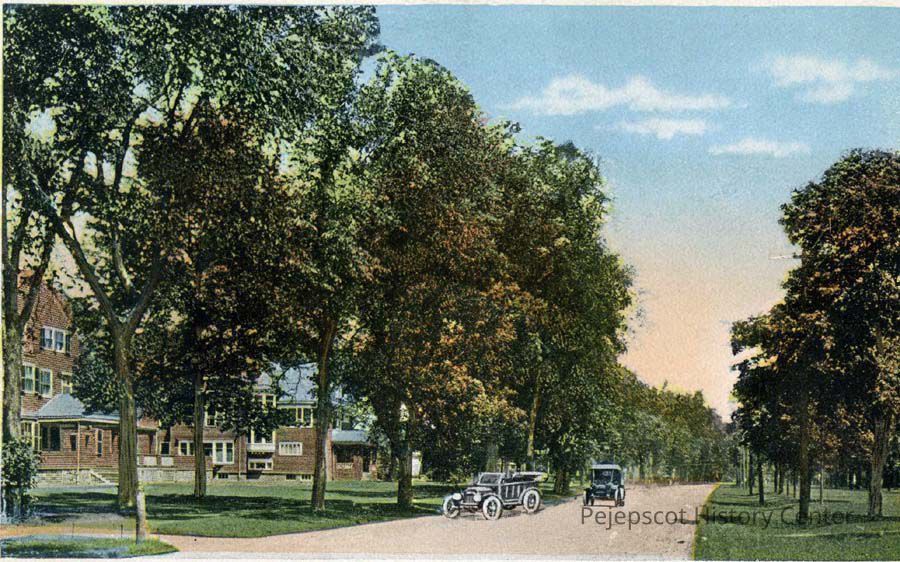 A color postcard shows South Maine Street in Brunswick, Maine. 9/20/1917Collection