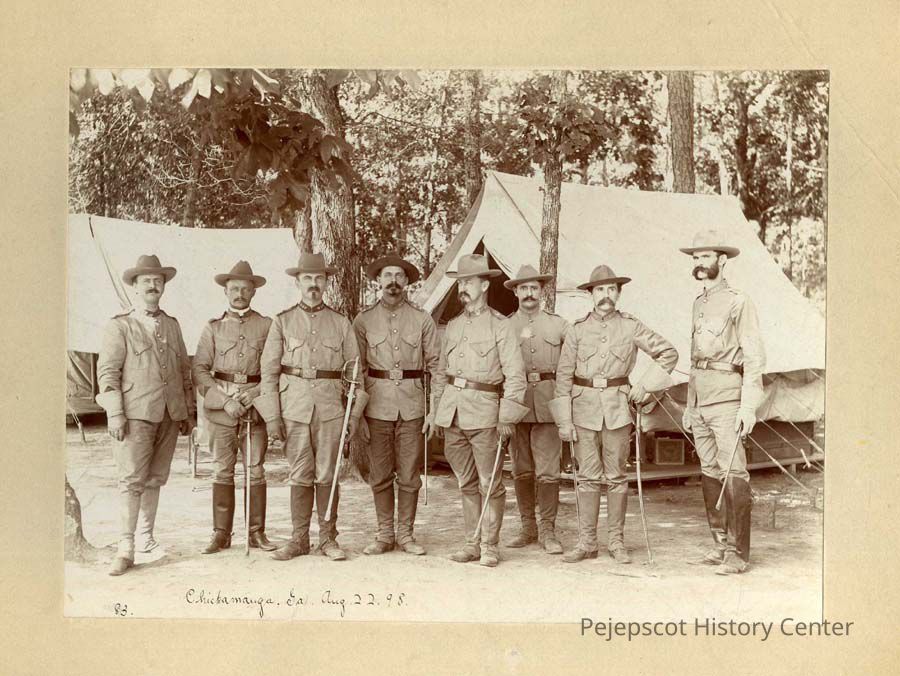 Sepia mounted photograph of 8 Spanish American War soldiers standing in front of 2 tents. Handwritten on bottom reads "Chickamauga, GA. Aug. 22, '98." On back noted "Right Wm. Peterson, 5th from right Dr. Elliott, Brunswick, Maine." Photographer is L. Stargardter, 37 Market Sq., Chattanooga, Tenn. 307 President St., Brooklyn, N.Y.Lexicon