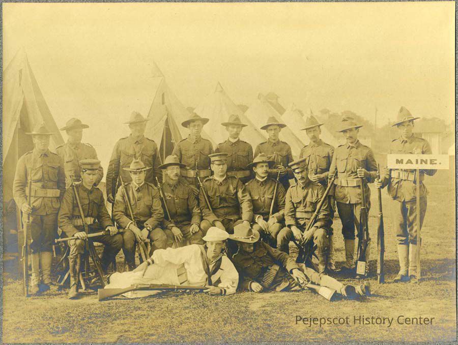 Sepia photograph on gray mat of 17 Spanish American War soldiers in a field in front of tents. Nine are standing, six are seated, two are lying on ground. All have rifles; first soldier standing on right holds a sign which reads "Maine." On back Dr. Elliott identified as "right seated 2nd"; note reads "State of Maine Rifle Team, Seal Point 1900." Photograph by Goldberg Brothers, 22 Avon Place, Newark, N.J.Lexicon