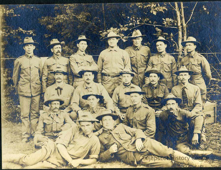 Black & white photograph of 18 Spanish American War soldiers, 7 standing, 9 sitting, 2 lying on ground. The man on the ground on the right is identified as Dr. Elliott.