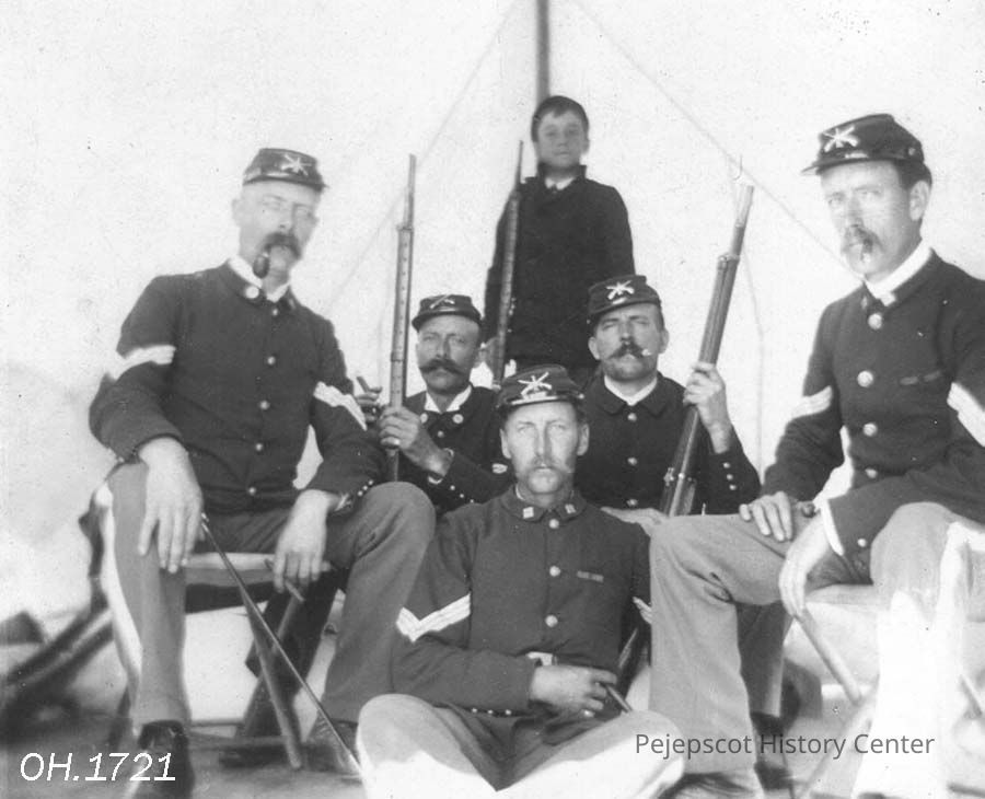 A picture of five men in uniform sitting on the floor and in chairs with a young boy standing in the background inside of a military tent. Dated 1898 indicates the military setting, the Spanish American War.