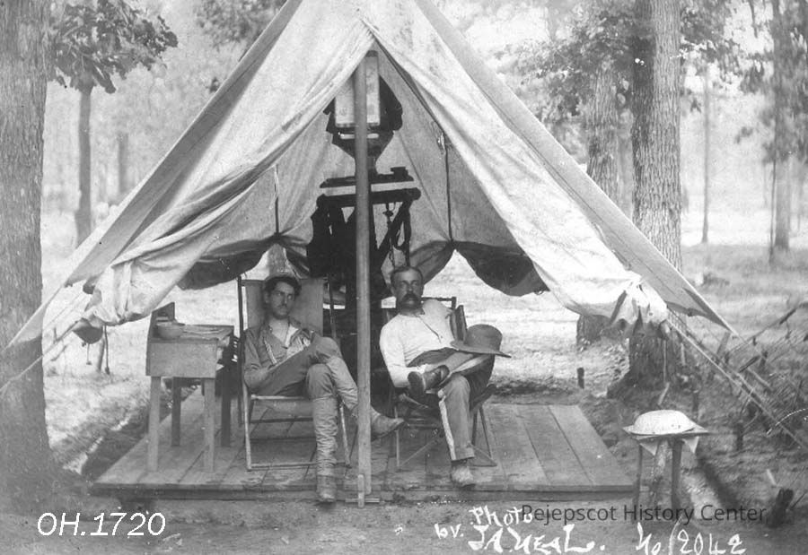 A view of two unidentified men relaxing in chairs inside of a military tent, probably during the Spanish-American War. Undated