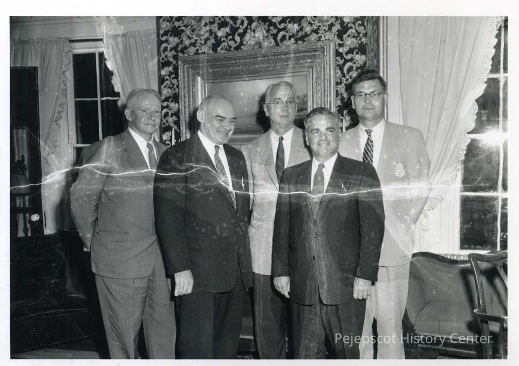 Five men connected with the SPCA and Humane Society pose for the camera on May 4, 1955. They are: Albert A. Pollard, Director of Education, Mass. SPCA; John C. MacFarlane, Director of LIvestock Conservation, Mass. SPCA; Dr. Eric W. Hansen, Pres., Mass. SPCA; Guy W. Mann, Boston Animal Reserve League; Lester A. Giles, Disaster, Wildlife Conservation, Mass. SPCA.Lexicon