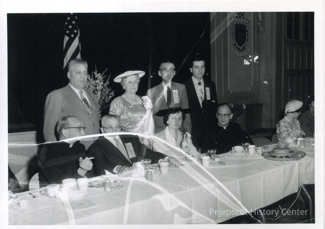 This photo shows 8 people (possibly the council members) posing behind a banquet table as part of the St. Charles Church Council celebration of its 50th anniversary.