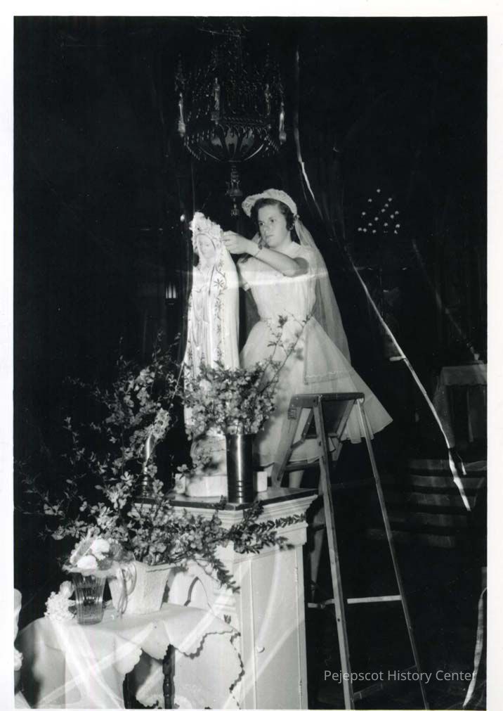 At St. Charles Church a girl wearing a veil stands on a ladder to adjust a headdress on the Virgin Mary.
