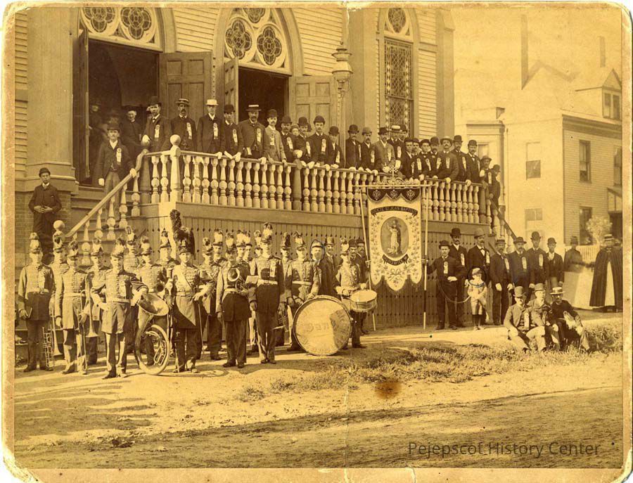 Photo of St. Jean Baptiste Band and Societe St. Jean Baptiste in front of St. John's Church, Pleasant Street Brunswick, ME, before 1912. Cabinet photograph.
