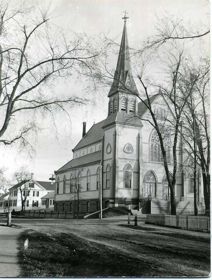 A black and white photo of the St. John the Baptist Church on Pleasant Street taken from Union Street.