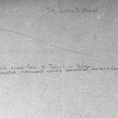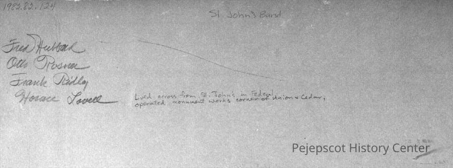 A B/W photograph of St. John's Band, Brunswick, ME. The band consists of a group of 23 men in matching, high collared coats, and military style caps. Joseph Saindon is 5th from the left in the second row. Others identified are Fred Hubbard, Otto Rossner, Frank Ridley and Horace Lovell (positions unknown). Dated c. 1900s.Collection