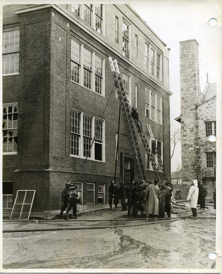 A black & white photograph of a fire at St. John's Catholic School on Pleasant Street, Brunswick, ME. Firemen can be seen grouped around the bottom of the ladders as one fireman climbs the ladder. Dated May 6, 1943.