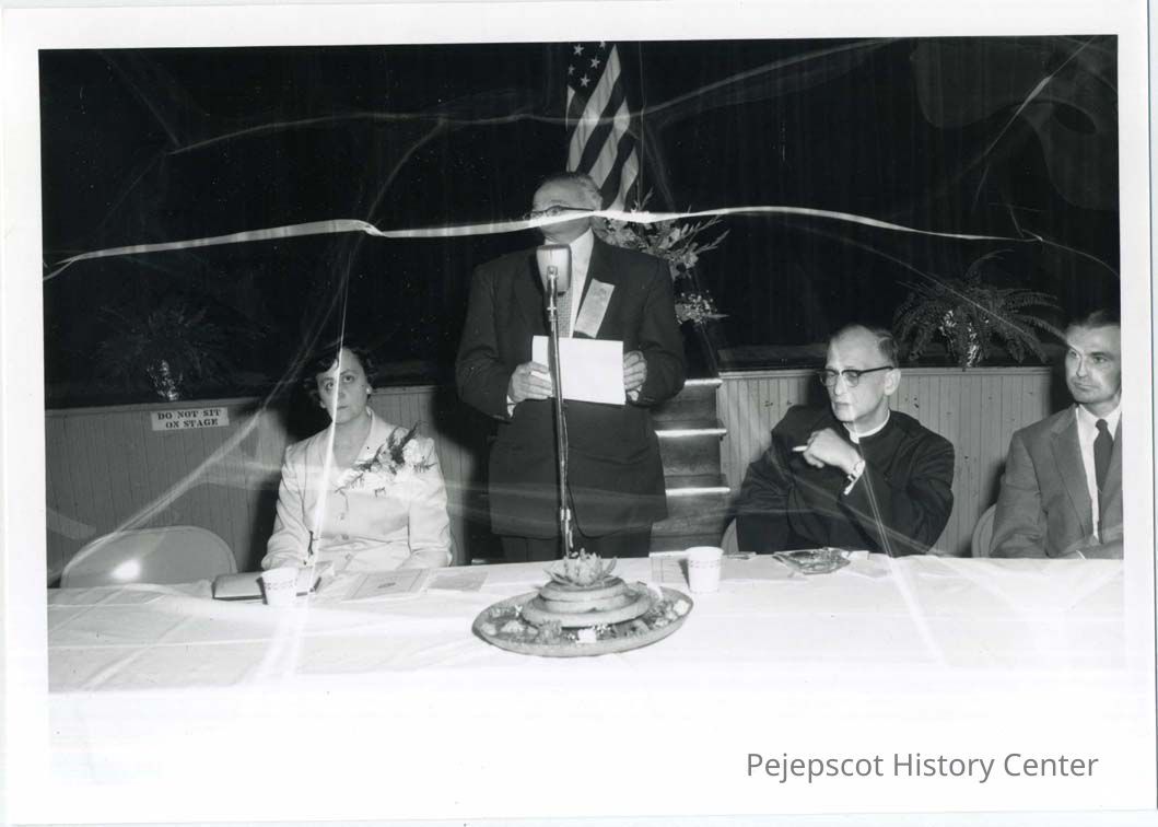The photo shows four people sitting at a table with a mic in the middle. One man is speaking about the St. John's Council 50th anniversary. Three of the people are Mrs Jeanne Lebel, Henry J. Gagnon, and Rev. Edmund Soucey.