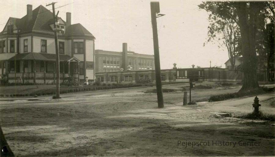 A B/W photographic view of St. John's School, Rectory and basement of the church during rebuilding. Undated