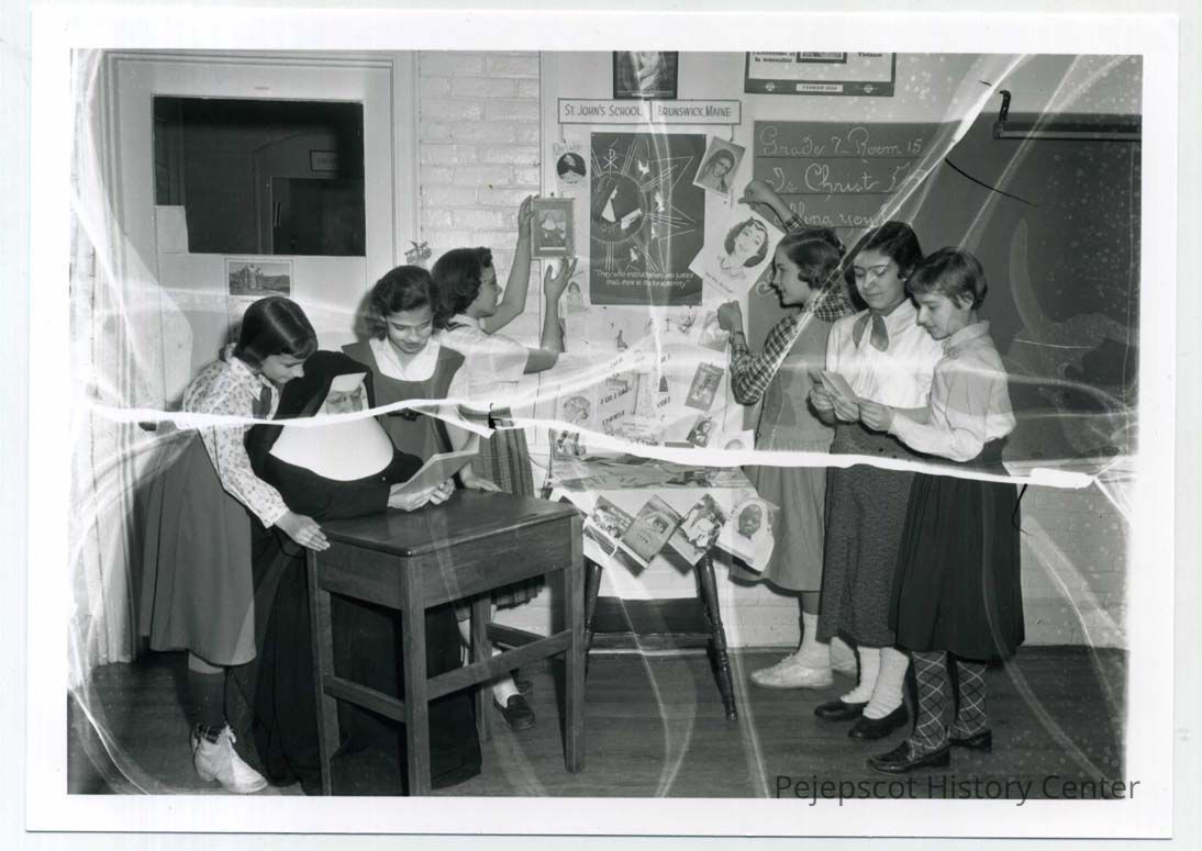This photo shows six girls and a nun in a classroom at St. John's School. The nun is seated at a desk reading as 2 girls look on. Two girls are holding a card and reading it and 2 girls are tacking cards to the wall.