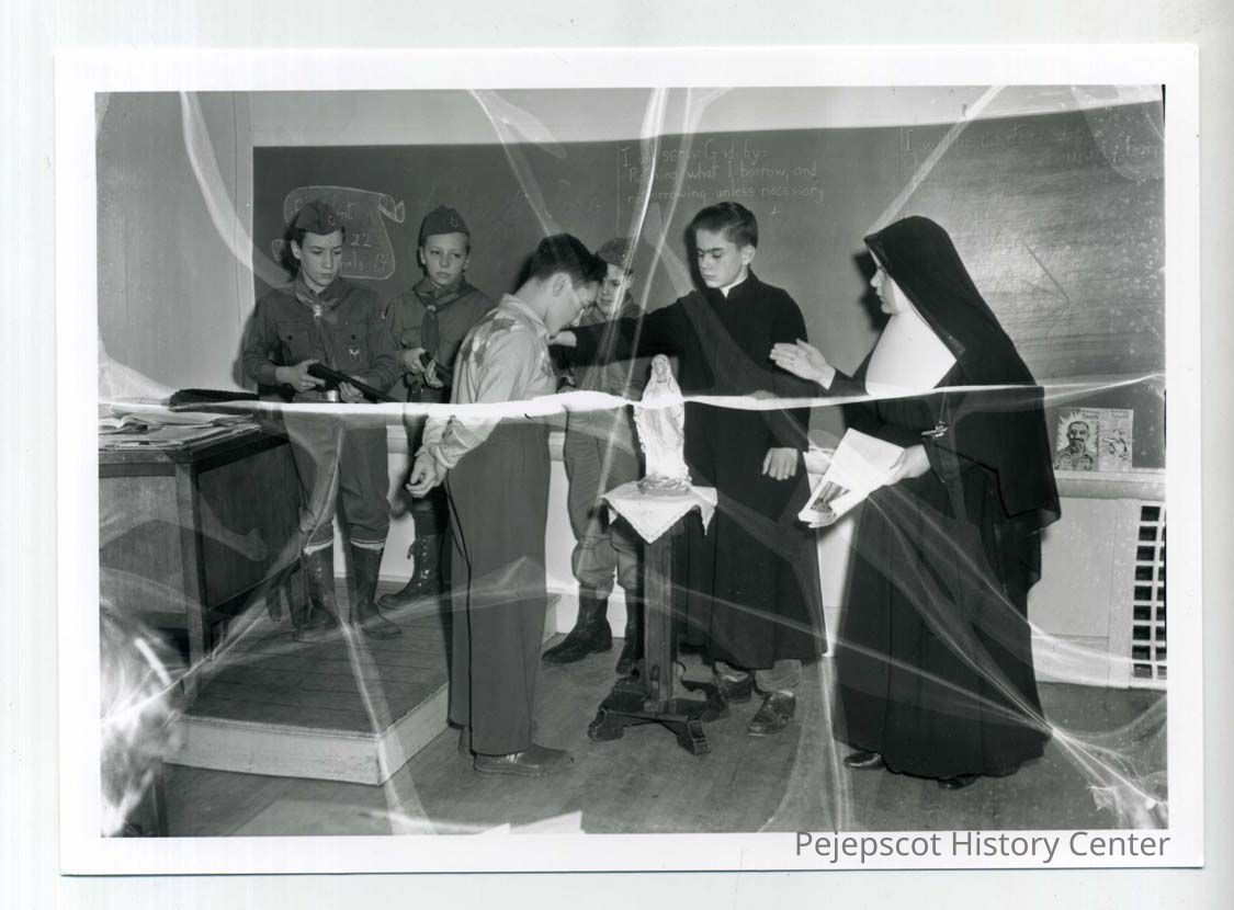 In a play at St. John's School 3 boys are in scout uniforms stand at the back while another boy stands in front of a boy dressed as a priest. He is flanked by a girl dressed as a nun. The "priest" has his hand on a boy's shoulder while the he looks at a small statue of the Virgin Mary on a table.