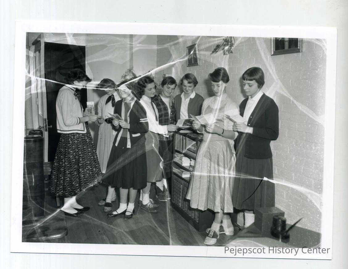 A girls stand possibly in a teacher's office at St. John's School.