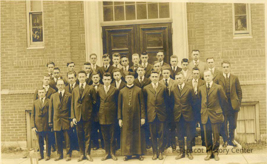 A B/W photograph of St. John's School students in front of the school. The priest is Jean P. LeTarte. Some names are on the back of the photo.