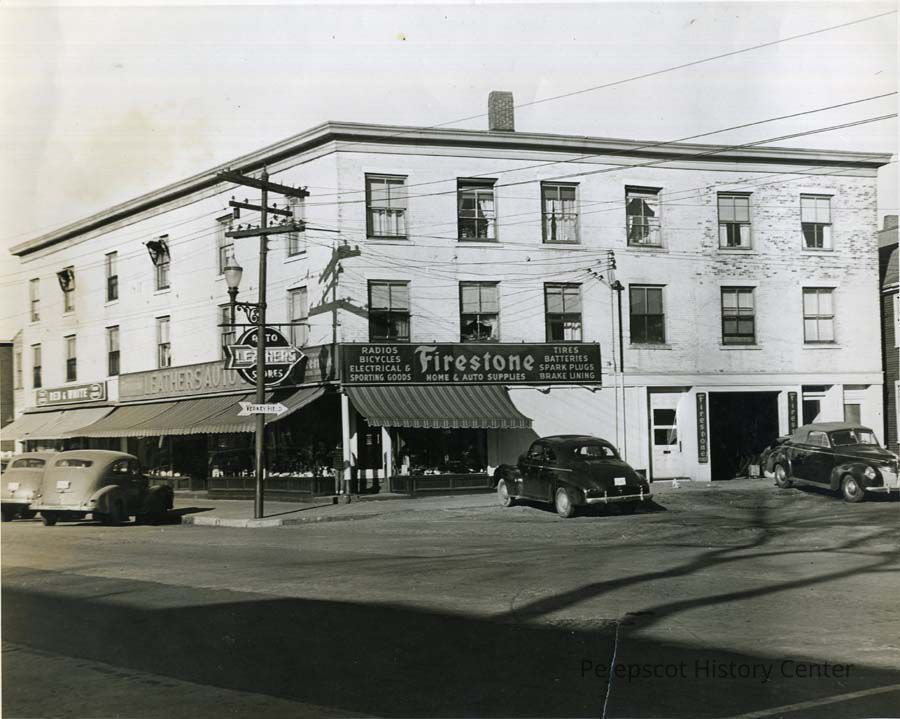 A B/W photograph of the St. Onge Block, corner of Maine and Mason Street, Brunswick. Leathers Auto Firestone Garage and the "Red & White" Store were located on the first floor with apartments above. 45-53 Maine Street, 3-7 Mason Street. This building burnt in 2011. ca 1930s.
