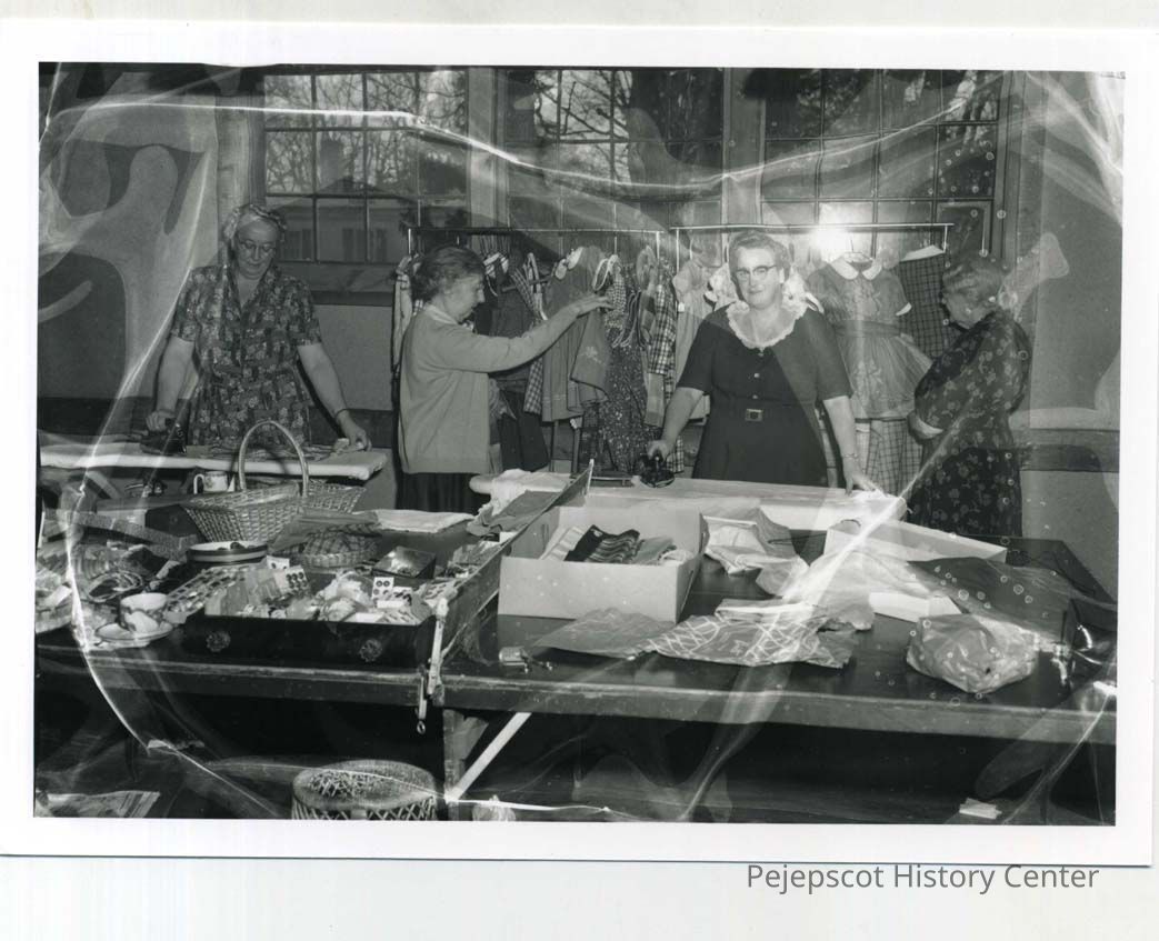 Four ladies of St. Paul's Church work in Codman House toget clothes ironed and hung for a sale. On tables in the foreground are sewing supplies and more clothes.
