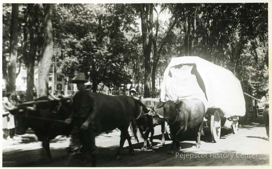 A B/W photograph of a stagecoach pulled by oxen at the Brunswick Bicentennial parade. Dated 1939