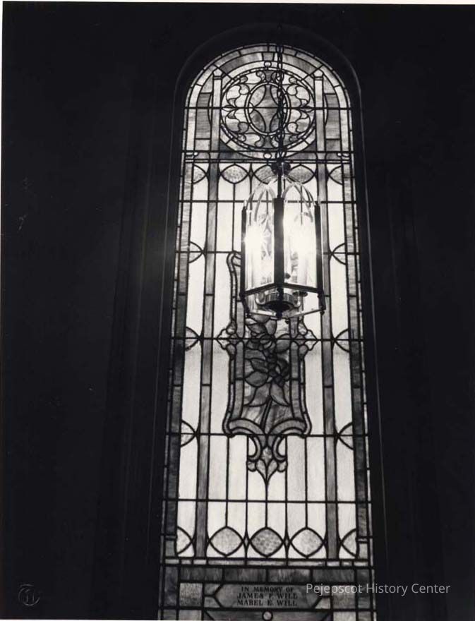 A B/W photograph of a stained glass window at the United Methodist Church. The window is dedicated in memory of James F. and Mabel E. Will. Undated