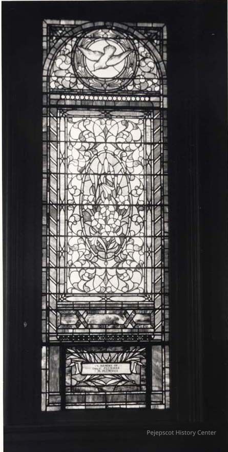 A B/W photograph of a stained glass window at the United Methodist Church. The window is dedicated to Isaac Plummer and J. M. Plummer. Undated