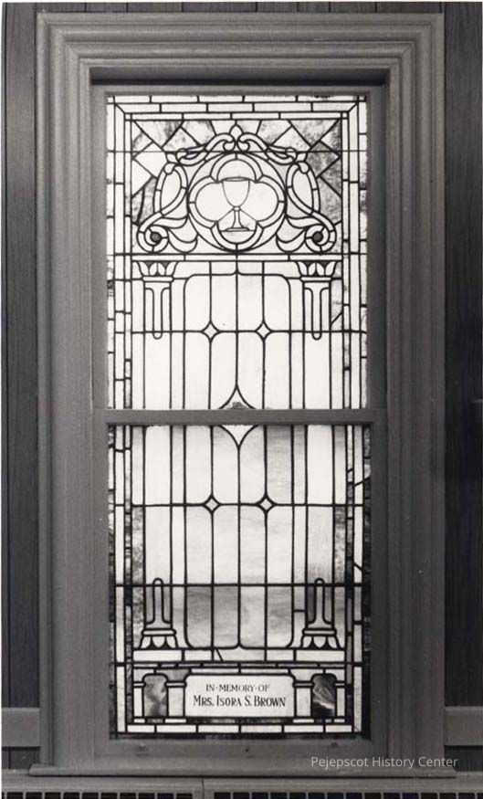 A B/W photograph of a stained glass window at the United Methodist Church This window is dedicated to Mrs. Isora S. Brown. Undated