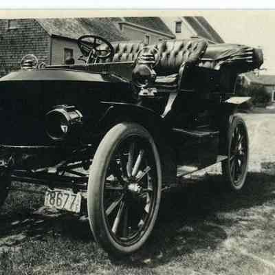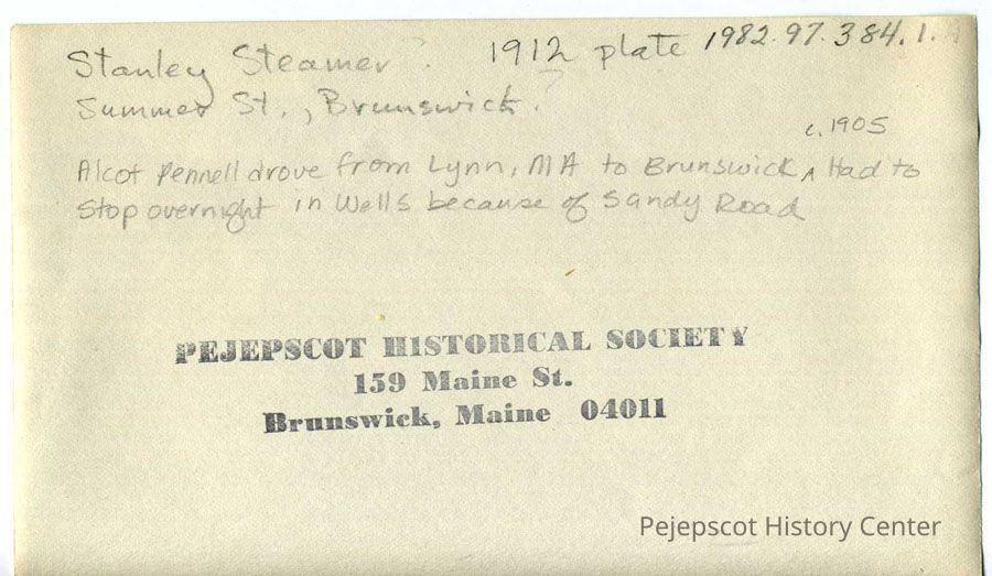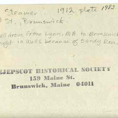 Stanley Steamer automobile c. 1912. The year 1912 appears on the license plate. According to the notes on the back of the photo, the location might be Summer Street. The Pennells had a house at 11 Summer Street, Brunswick (there are several photos of it in this accession). Notes on the back of the card also refer to a 1905 auto journey from Lynn, MA to Brunswick by Alcot Pennell.
