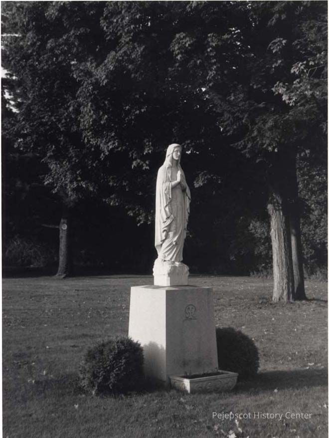 A B/W photograph of statue of the Virgin Mary at St. John's Church on Pleasant Street. 9/31/1988.