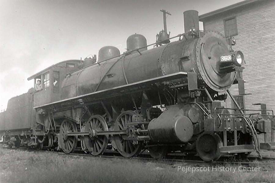 A B/W photograph of a steam locomotive with the number, "363" painted on it. Marked on back; "1936 Henry (Preble?) in cab Brunswick" This appears to be a small duplicate of 2017.477.6.