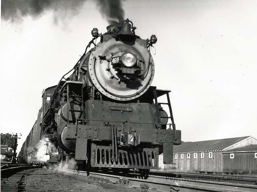 A B/W photograph of a steam locomotive with the number "469" on it. On the back of the photo is written, "Henry Preble Photo at Brunswick No. 469".